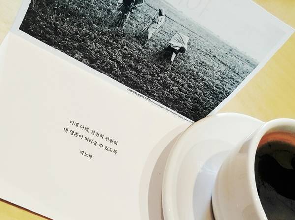 ‘더디 가더라도 함께 손잡고 나아가기를. 함께 가더라도 자신만의 길을 찾아가기를. 자유란 홀로 선 외로운 나무가 아니라 ‘함께하는 혼자’로 숲을 이루는 푸른 나무인 것을.’ 사진마다 달린 박노해의 이야기는 소담하고 따뜻했다. 더디 가는 내게 그곳이 어디든 홀로가 아니라고, 함께 하는 혼자들이 많다고, 사진이 위로해준다. 시인의 고요한 알림과 깊은 향의 커피가 공존하는 공간에서 혼자 그리고 함께, 소박한 삶의 가치를 알아가는 인생을 꿈꾼다.