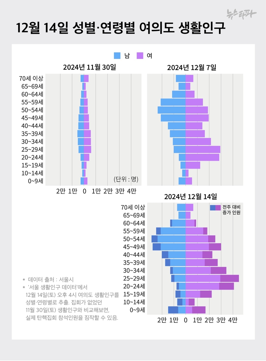 비상계엄령 사태 전 주말인 11월30일에는 여의도동의 하루 최대 인구는 9만 8000여 명이었다. 14일 집회 때와 차이는 42만명으로 그만큼이 집회 참석자 수로 추정된다. 같은 방식으로 구한 7일 첫 집회 참석자 수는 27만8000여명이다. 국민의힘이 불참해 첫 투표가 정족수 미달로 무산된 뒤 집회 규모는 절반 넘게(14만 명 이상) 커진 것이다.