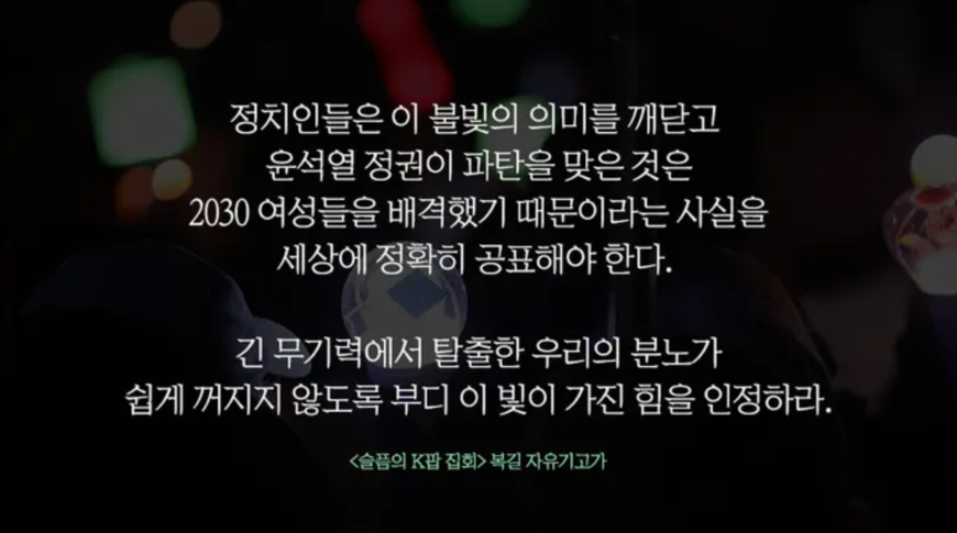 여성 살해 사건을 추모하던 2016년 강남역 집회, 불법촬영 편파수사를 규탄하는 2018년 혜화역 집회, 2022년 스토킹 살인사건을 추모한 신당역 집회 등 이미 오래전부터 사회 참여 경험이 누적됐고, 위헌적인 계엄사태라는 특수한 계기로 그 수가 더 많아졌을 뿐이라는 것이다.