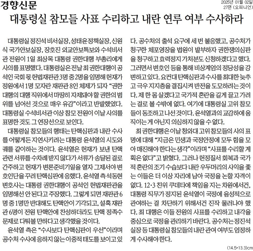 최 권한대행은 국정안정에 매진해야 한다며 사표 수리를 하지 않겠다고 했다. 그러나 경향신문은 사표 수리는 물론 이들의 내란 관여 여부도 수사해야 한다고 주장했다. 경향은 이날 사설에서 “헌정질서 회복과 국가적 혼란의 조기 수습보다 내란 우두머리의 사익을 좇는 이들은 더 이상 자리에 남아 국정을 논할 자격이 없다. 12·3 친위 쿠데타에 책임을 지는 차원에서건, 대통령 직무가 정지된 윤석열이 국정에 음성적으로 관여하는 걸 차단하기 위해서건 진작 물러나야 했다”면서 “공수처는 정진석 실장 등 대통령실 참모들의 내란 관여 여부도 엄정하게 수사해야 한다”고 밝혔다.