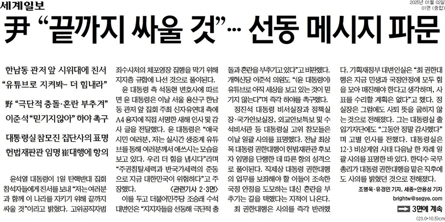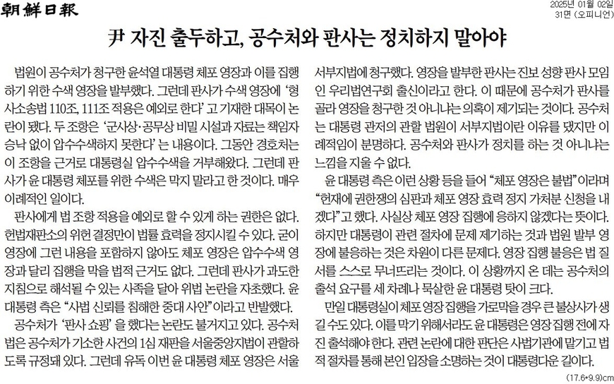 다른 신문들도 대부분 영장 집행 과정에서 불상사가 벌어질 것을 우려하며 윤 대통령이 자진 출두해야 한다고 촉구했다.