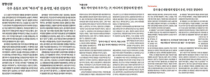 3일 아침 신문들은 새해 첫날 관저 앞에서 탄핵 반대 시위를 벌이는 지지자들을 선동하는 메시지를 내놓은 윤석열 대통령을 향해 더는 부끄러운 모습을 보이지 말고 사법절차에 응해야 한다고 호소했다.