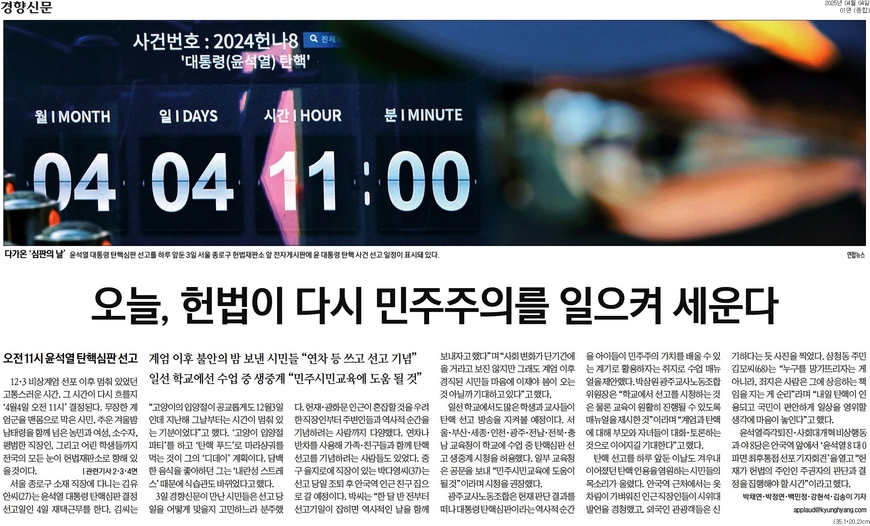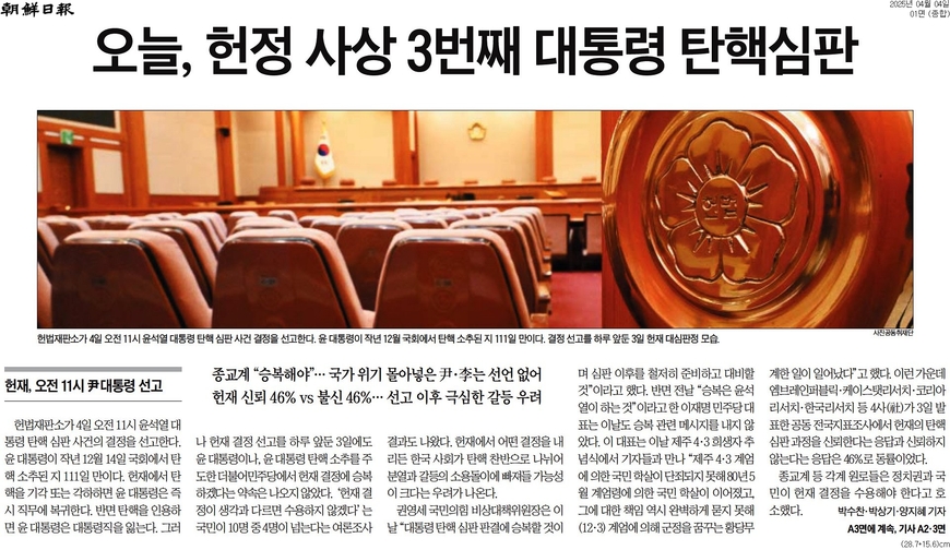 동아일보 <계엄 넉달만에, 오늘 오전 11시 尹 탄핵 선고>