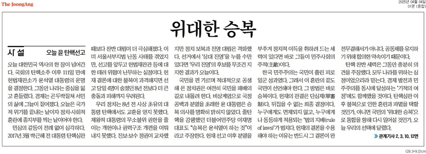 가장 눈에 띄는 건 ‘승복’이란 단어다. 중앙일보는 1면에 실은 ‘위대한 승복’ 제하의 사설에서 “오늘은 국가적 위기를 끝내는 날이자 정치·사회적 혼란에 종지부를 찍는 날이어야 한다”고 강조했다. 중앙은 “한국 민주주의는 국민이 흘린 피로 일군 성과였다. 그래서 이 혼란의 끝도 국민이 선언해야 한다”며 “그 방법은 바로 승복”이라고 했다. “헌재의 결론을 수용해야 하는 이유는 반드시 그 결론이 완전무결해서가 아니”라 “공동체를 유지하기 위해 합의한 약속이기 때문”이라는 것이다.