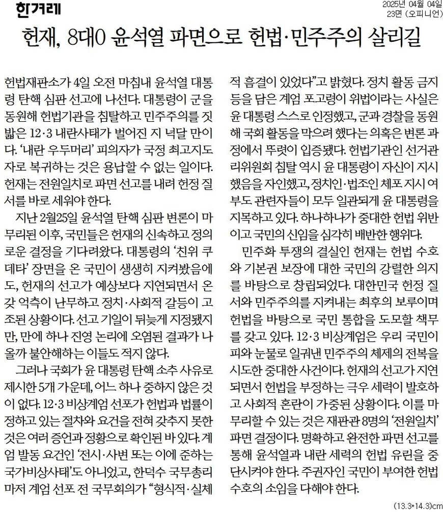 한겨레 <헌재, 8대0 윤석열 파면으로 헌법·민주주의 살리길>