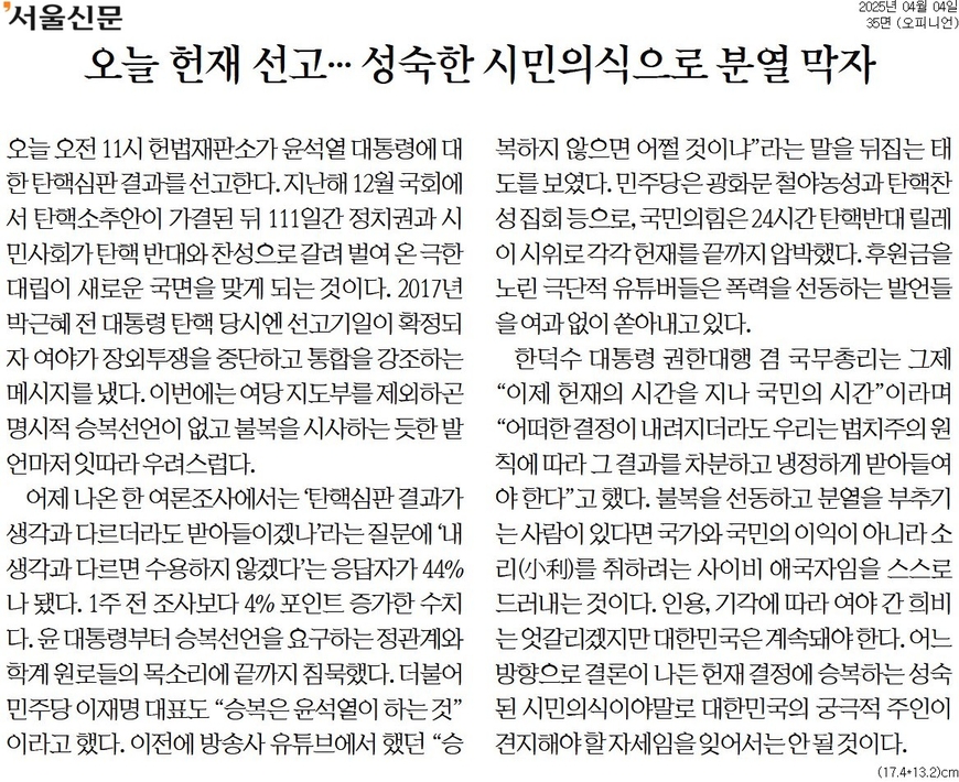 서울신문 <오늘 헌재 선고… 성숙한 시민의식으로 분열 막자>