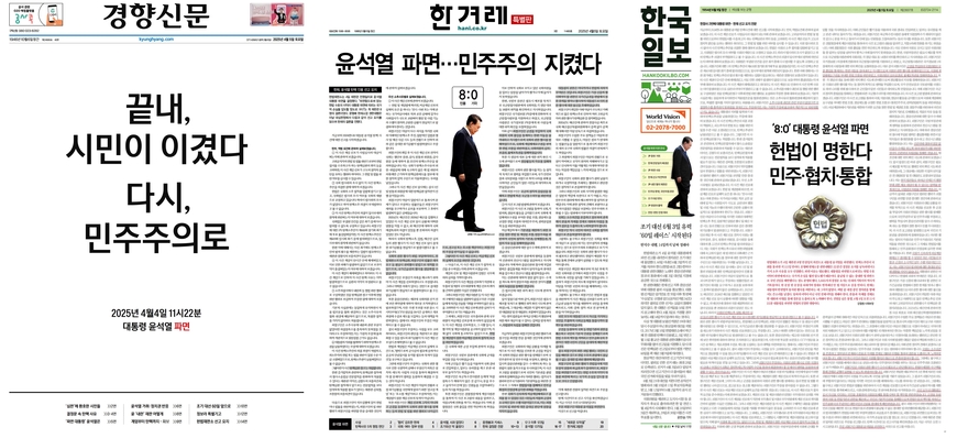 헌법재판소가 4일 전원일치 의견으로 윤석열 대통령에게 파면을 선고했다. 헌재는 결정문에서 5가지 소추 사유를 모두 인정했다. 대통령을 파면함으로써 얻는 헌법 수호 이익이 파면에 따르는 국가적 손실을 훨씬 압도한다고도 했다. 5일 대다수 신문사들은 과감한 1면을 선보이거나 사설을 1면 톱으로 배치하며 헌정 사상 두 번째 대통령 파면이란 사건을 조명했다. 신문 전반에선 ‘시민’, ‘민주주의’, ‘상식’, ‘정상화’, ‘통합’, ‘정치 복원(혁신)’ 등의 키워드가 핵심이었다.