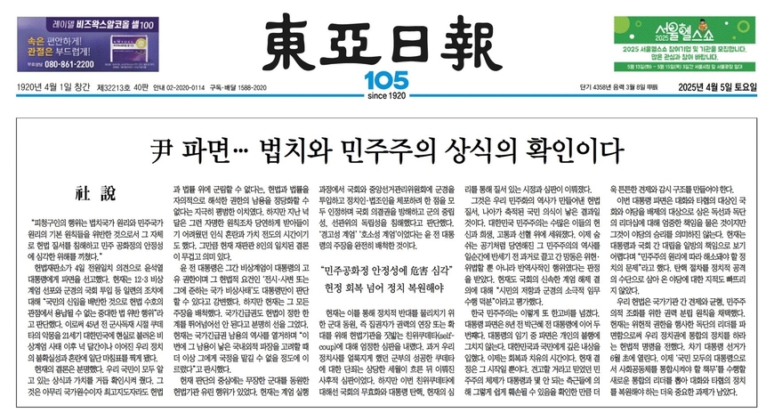 동아일보 <尹 파면…법치와 민주주의 상식의 확인이다>(1면)