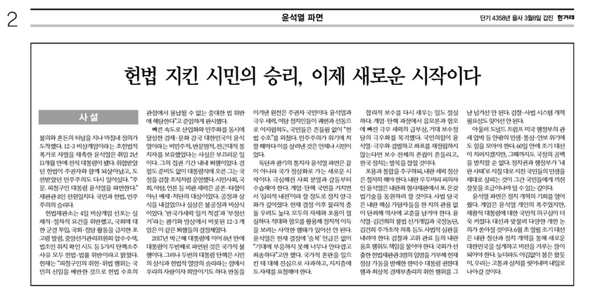 한겨레 <헌법 지킨 시민의 승리, 이제 새로운 시작이다>(2면)