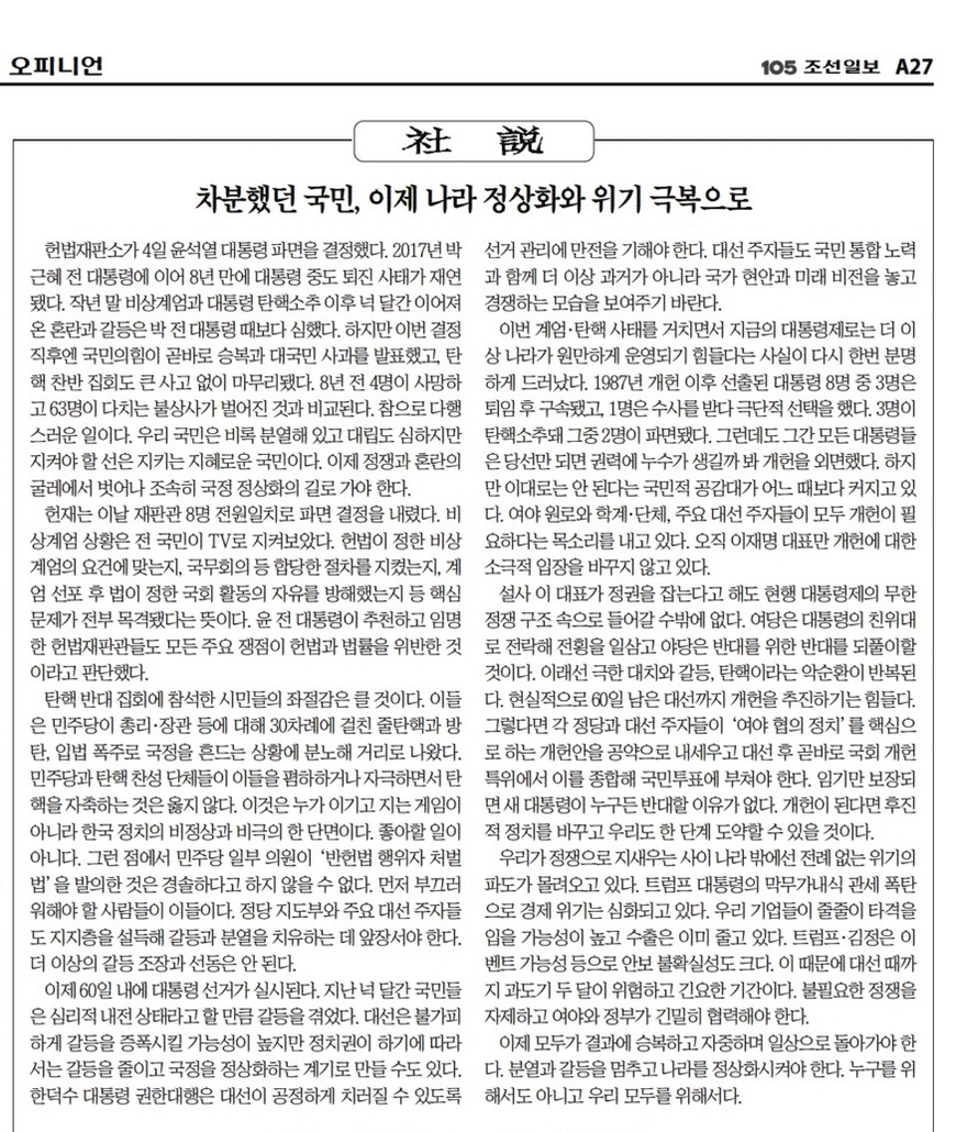 조선일보 <차분했던 국민, 이제 나라 정상화와 위기 극복으로>(27면)