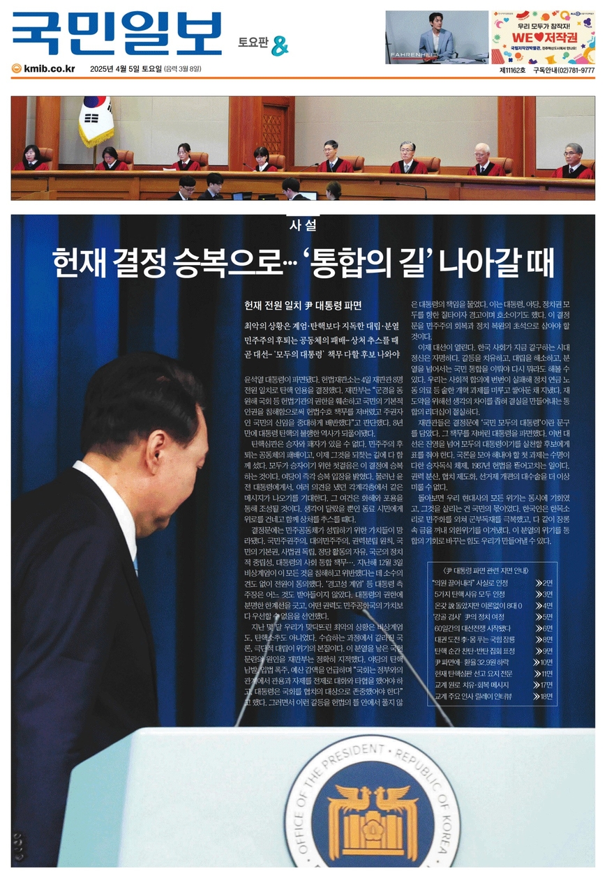 국민일보 <헌재 결정 승복으로…‘통합의 길’ 나아갈 때>(1면)