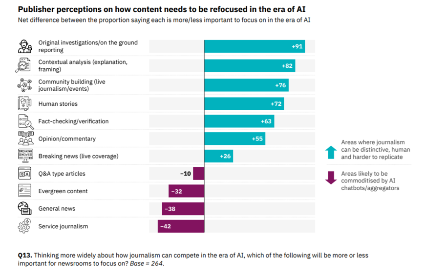 이 시기 언론으로서 방향성은 오히려 뚜렷해지고 있다. AI보다 비교우위에 있는 현장 취재, 심층 분석 및 구성, 라이브 이벤트와 같은 커뮤니티 구축, 인간적인 이야기, 사실확인 및 검증, 의견 논평에 집중해 차별화에 나서고 서비스저널리즘이나 에버그린 콘텐츠는 지양해야 한다는 것(로이터저널리즘연구소, 2026년 전망 보고서)이다. 니먼랩의 전망에서도 다수 전문가는 올해를 AI가 줄 수 없는 ‘현장의 명확성’과 ‘인간적 연결’을 통해 생존을 모색할 한 해로 예측했다.
