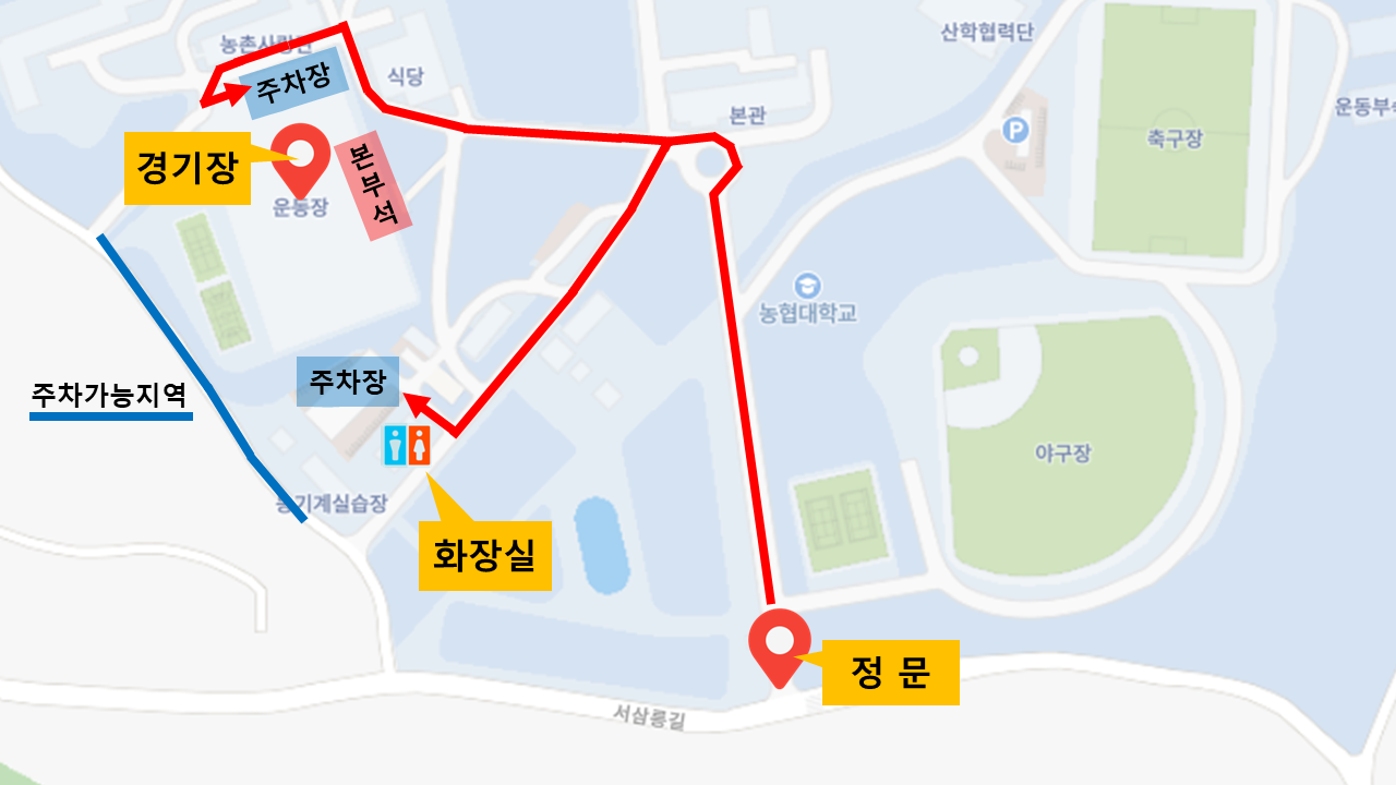 2. 주차장 관련 : 교내 진입 후 원형 교차로에서 7시 방향으로 진행 후 농기계 실습장 주차장, 농촌사랑관 앞 주차장 이용