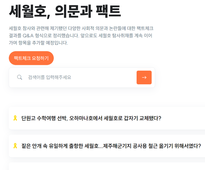 ‘의문과 팩트’는 세월호 참사와 관련해 제기됐던 다양한 사회적 의문과 논란들에 대해 엄밀한 팩트체크를 수행한 결과물을 Q&A 형식으로 정리했다. 뉴스타파는 향후 이용자들로부터 추가로 팩트체크가 필요한 주제들을 요청받아 검증을 거쳐 회신하거나 게시할 예정이다.