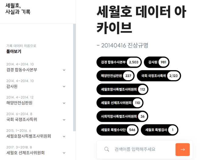 ‘데이터 아카이브’는 뉴스타파가 세월호 참사 이후 8년 동안 취재 과정에서 입수한 진상규명 관련 공식 기록물 6639건을 모았다. △검경 합동수사본부 △국회 국정조사 특위 △감사원 △해양심판원 △세월호 참사 특별위원회 △세월호 선체조사위원회 △사회적참사특별조사위원회△검찰 세월호 특별수사단 △세월호 특별검사 등 9개 기관이 생산한 문서와 동영상, 음성 파일 등 모두 6639건(55GB 분량)이 담겨 있다.
