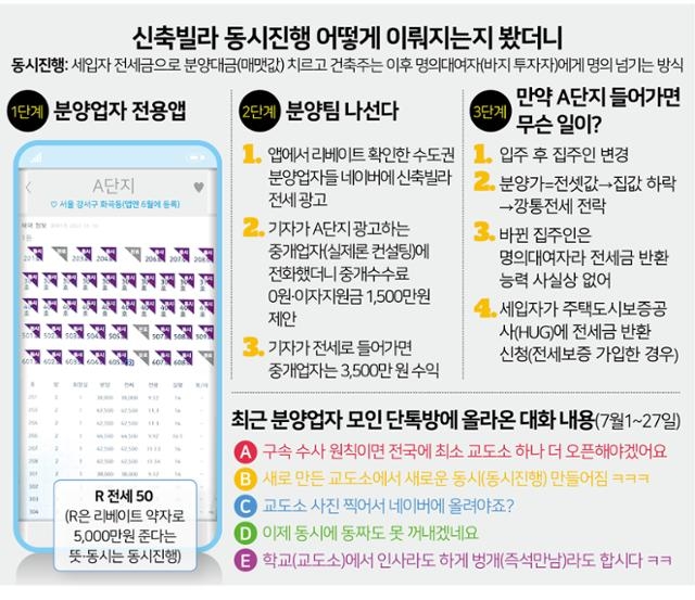 그동안 전세 사기 관련 기사가 피해 금액 규모 등 심각성을 전하는 수준에 그친 경우가 많았다면 한국일보 기획은 전세 사기가 어떻게 이뤄지는지 ‘구조’를 드러내고, 주요 유형을 알기 쉽게 정리했다는 점에서 의미가 있다. 한국일보는 ‘내부자’ 제보 등을 통해 전세 사기의 핵심인 ‘동시진행’ 매물을 추적하고, 취재기자가 직접 세입자인 척 중개업자에 접근해 ‘깡통전세’가 어떻게 만들어지는지를 알아냈다. 동시진행은 세입자 전세금으로 분양대금(매맷값)을 치르는 걸 말하는데, 깡통전세가 이에 해당한다. 거금의 이사지원비로 세입자를 유혹하면서 그 몇 배의 수수료를 중개업자(컨설팅업체)가 챙기고, 명의는 ‘바지 집주인’에게 넘기는 방식이다. 만약 신축 빌라 전세를 구하는데 중개업자가 거액의 이사지원비를 주겠다고 한다면? 깡통전세를 의심해야 한다. 한국일보는 한 분양 관계자의 말을 빌려 “서울·수도권에서 진행 중인 신축 빌라 분양은 90%가 동시진행 방식으로 진행된다”고 전했다.