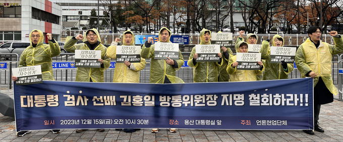 검사 출신 김홍일 국민권익위원회 위원장이 방송통신위원장에 지명된 지 9일째인 15일, 언론현업단체들이 공식적으로 김홍일 후보자 지명에 반대하는 입장을 발표했다. 전국언론노동조합과 한국기자협회, 한국영상기자협회, 한국PD연합회 등 언론현업단체들은 이날 용산 대통령실 앞에서 기자회견을 열고 ‘자수성가’한 소년가장 출신에 대통령의 ‘검사 선배’라는 게 방통위원장 자격 요건이 될 수 없다며 김홍일 후보자 지명을 철회할 것을 요구했다.