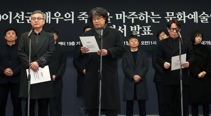 29개 문화예술관련 단체를 중심으로 결성된 ‘(가칭)문화예술인 연대회의’는 이날 서울 중구 한국프레스센터에서 기자회견을 열고 지난달 27일 고인이 목숨을 끊기까지 2개월 넘게 이어진 경찰 수사와 언론 보도를 “인격살인”이라 규정하며, 재발 방지를 위한 대책 마련과 입법 등을 촉구했다. 이날 기자회견엔 고인의 대표작인 영화 ‘기생충’의 봉준호 감독을 비롯해 장항준 영화감독, 가수 윤종신, 배우 김의성, 영화 제작자 장원석 대표 등이 참석했다.