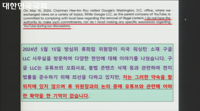 21일 국회 과학기술정보방송통신위원회 국정감사에서 류 위원장과 어떤 약속도 하지 않았다는 마컴 에릭슨 구글 부사장의 편지가 공개됐다. 최민희 더불어민주당 의원(과방위원장)이 받은 이 편지에서 에릭슨 부사장은 “류 위원장과 논의 중 유튜브와 관련한 확약을 한 기억이 없다”고 말했다.